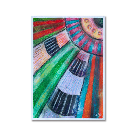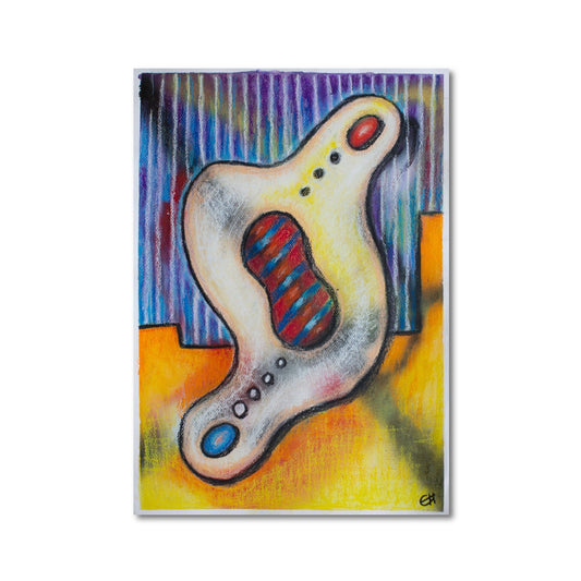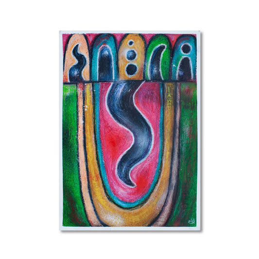 A mixed media project on watercolor paper. The framing is used to present the artwork. The art works are built up layer by layer. Pencil drawings covered with water color, oil pastels and spray paint.