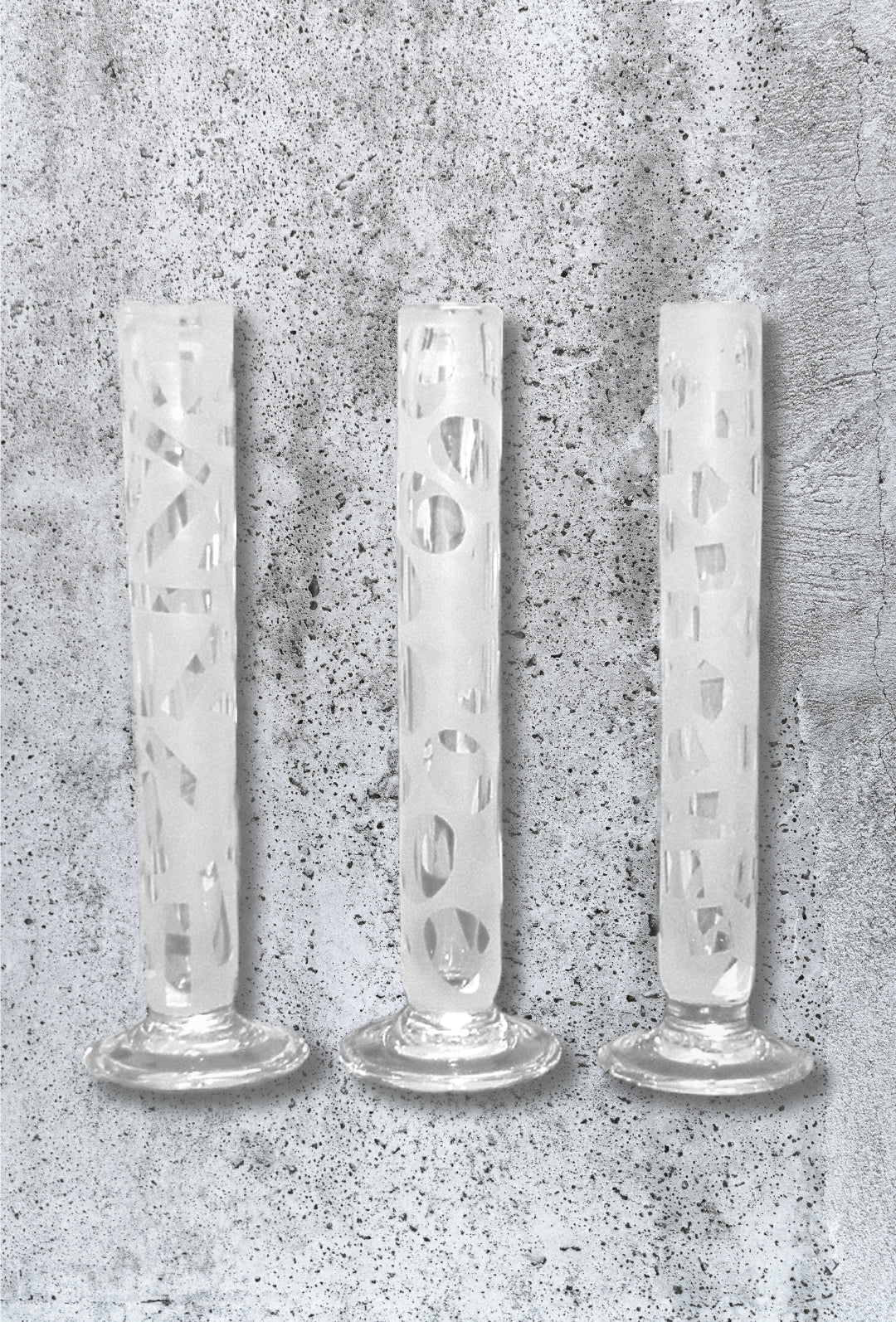 These three vases was part of Elin's exam at art Vargstad College in 2004, were she did parts of her art education. The vases was part of a bigger installation with a collage of black and white photos of water, soil and snow and the vases was placed as the foreground of the installation. The vases is mouth blown without molds and sandblasted by Elin.