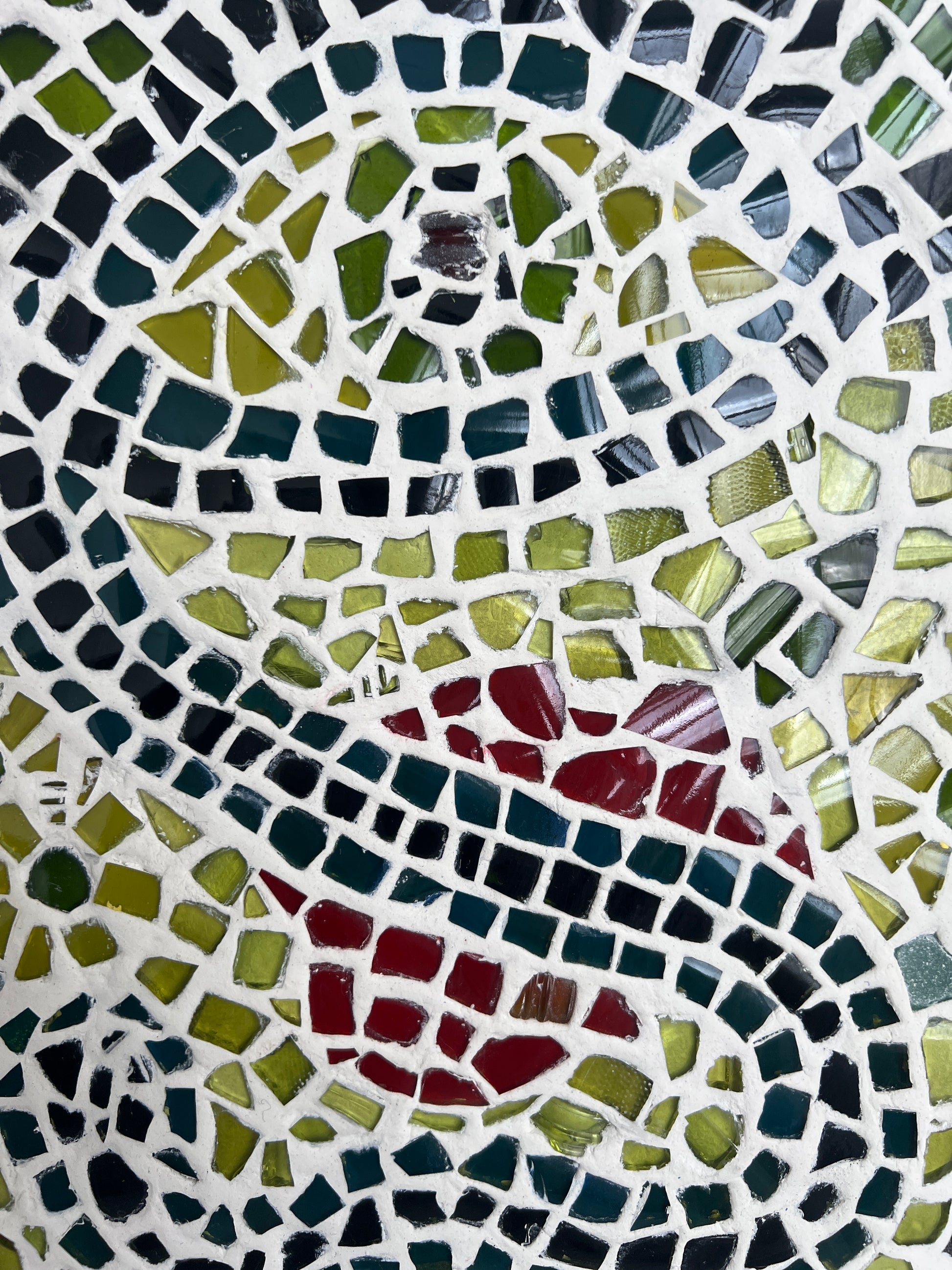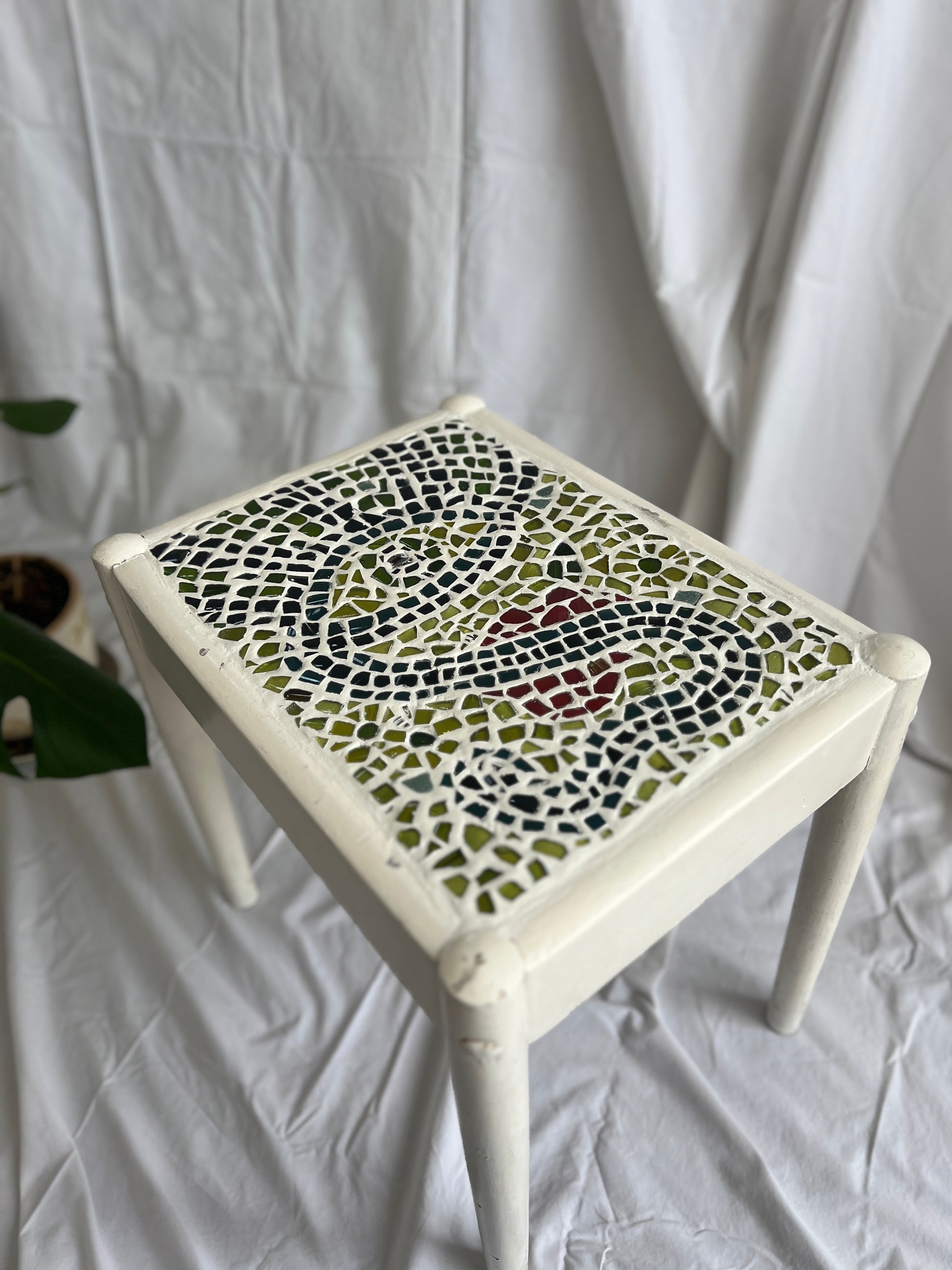 Glass mosaics from up-cycled glass pieces in the series of 'Return to Earthiness' mounted on a second hand table.