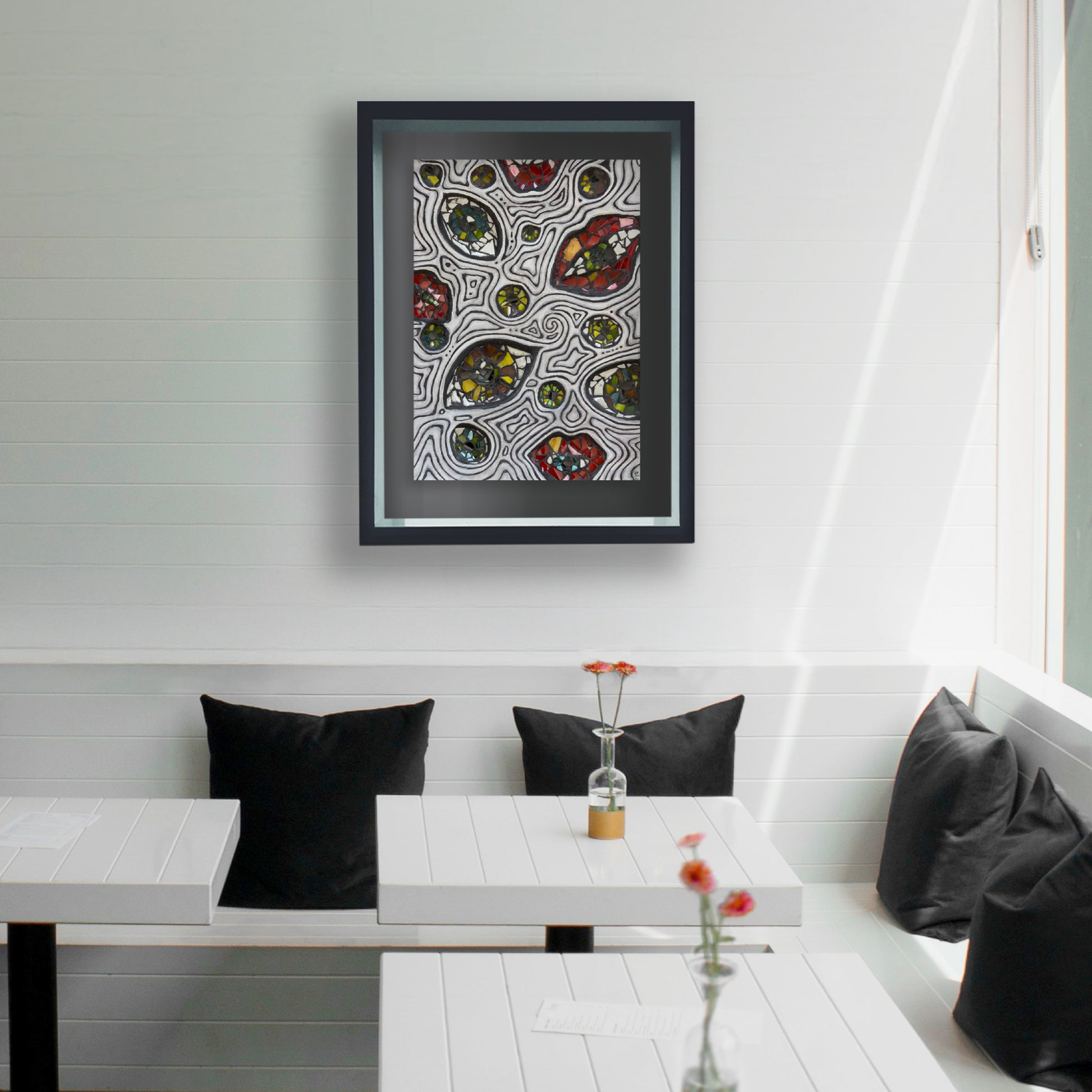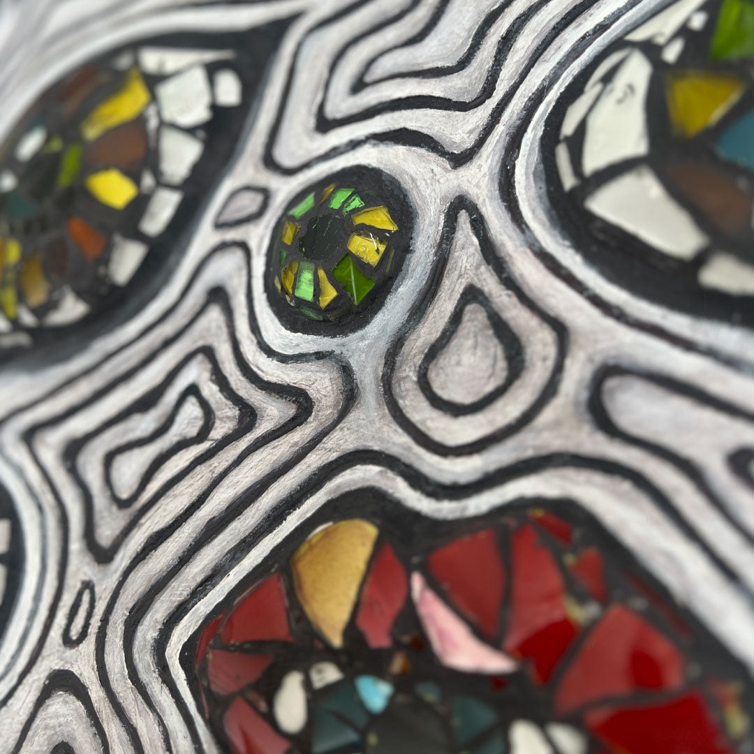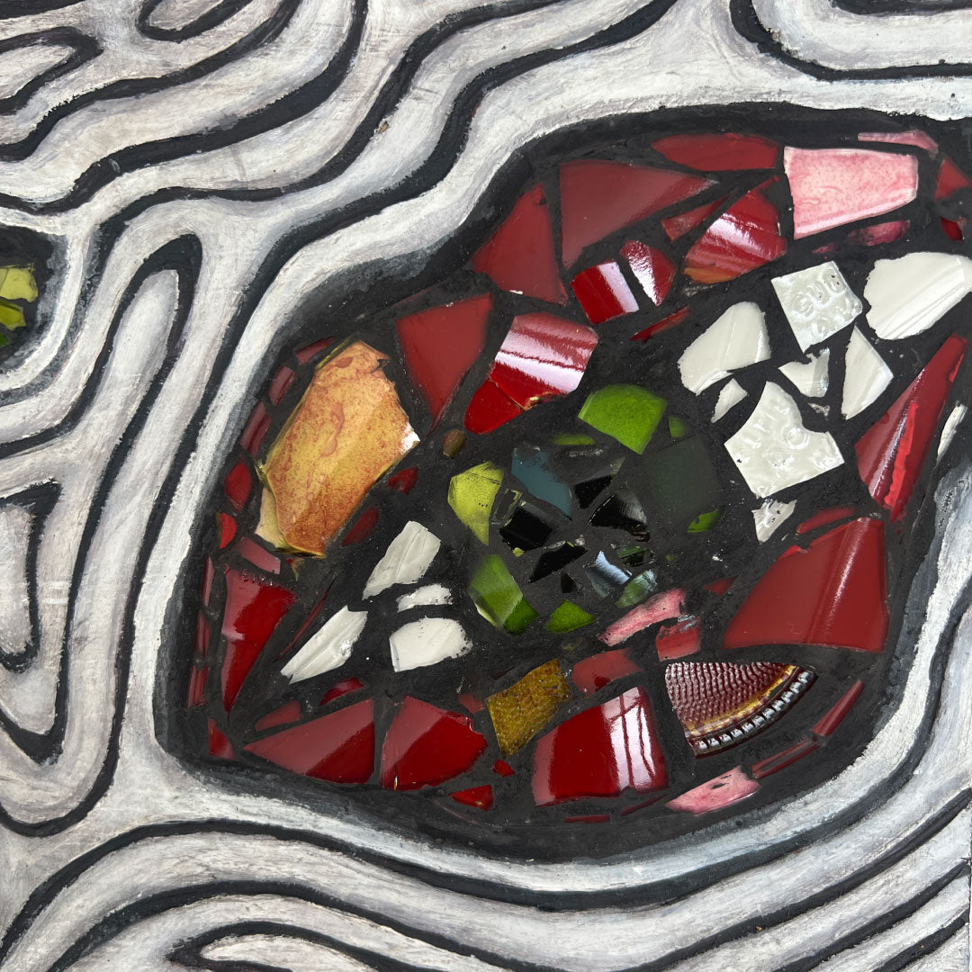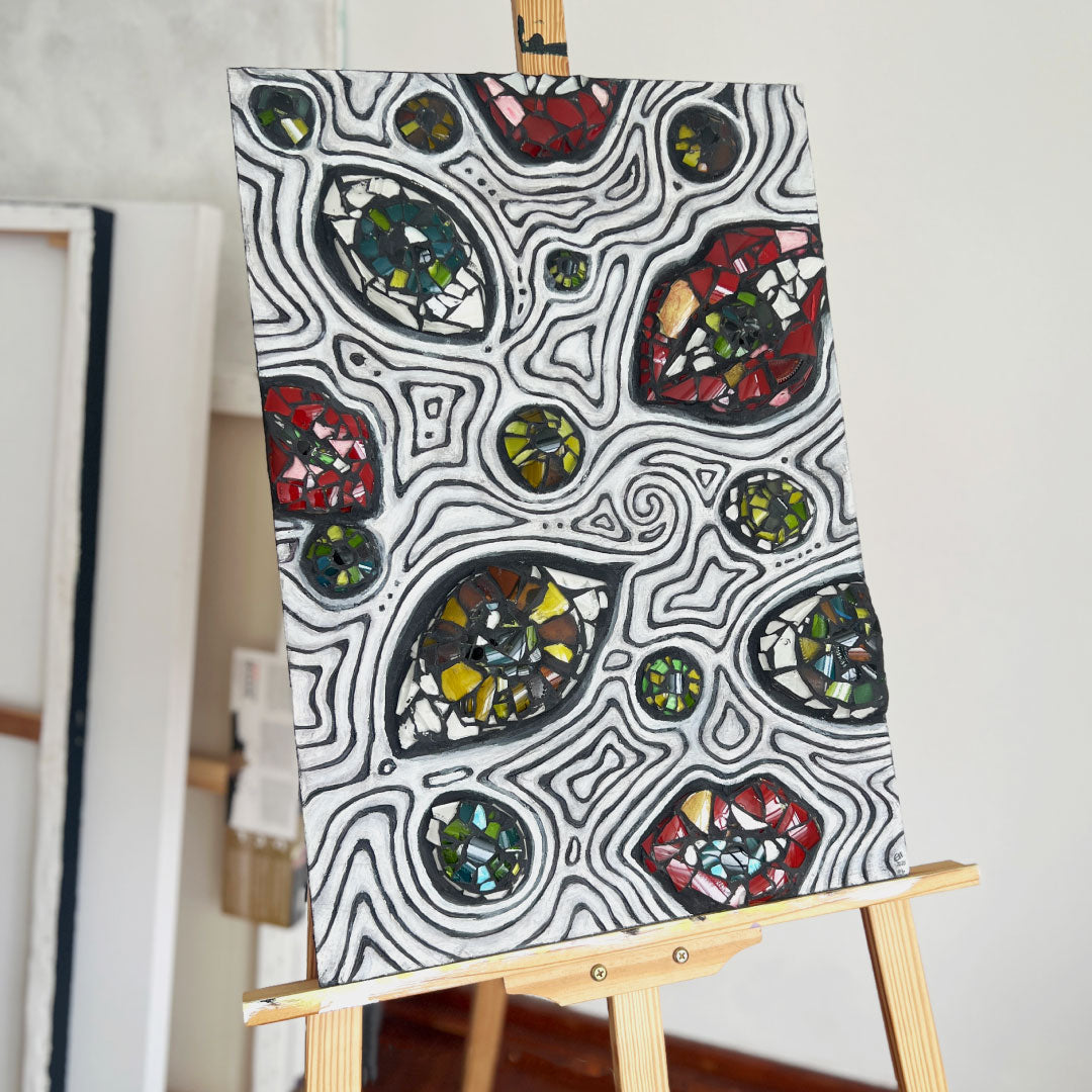 The unique mixed media artwork in the series 'Return to Earthiness' is made of up-cycled glass mosaic and painted woodcut. The board the artwork is made of and the mosaics are mounted on, is plywood.