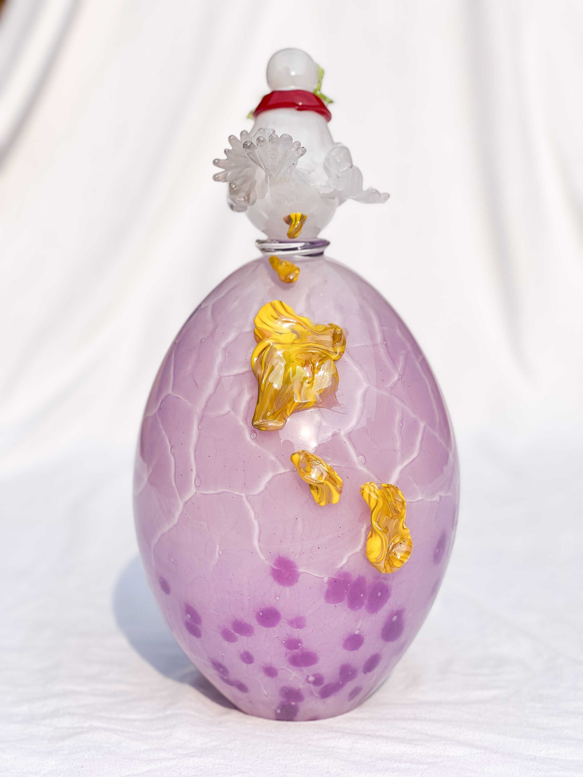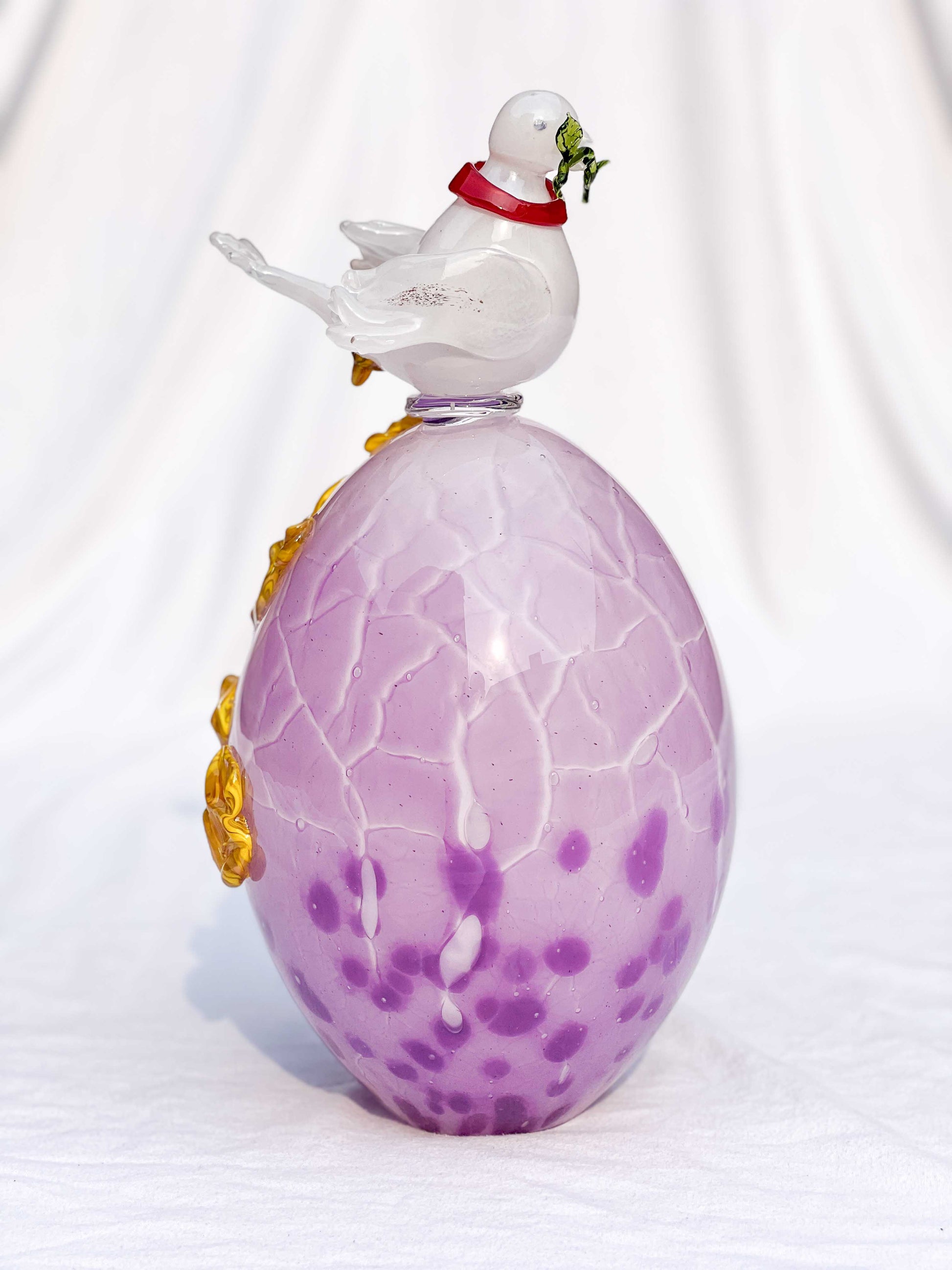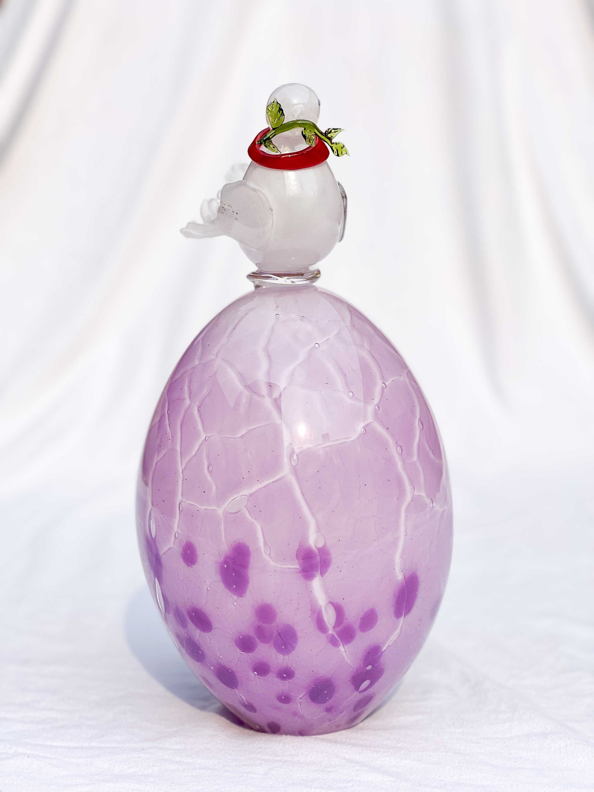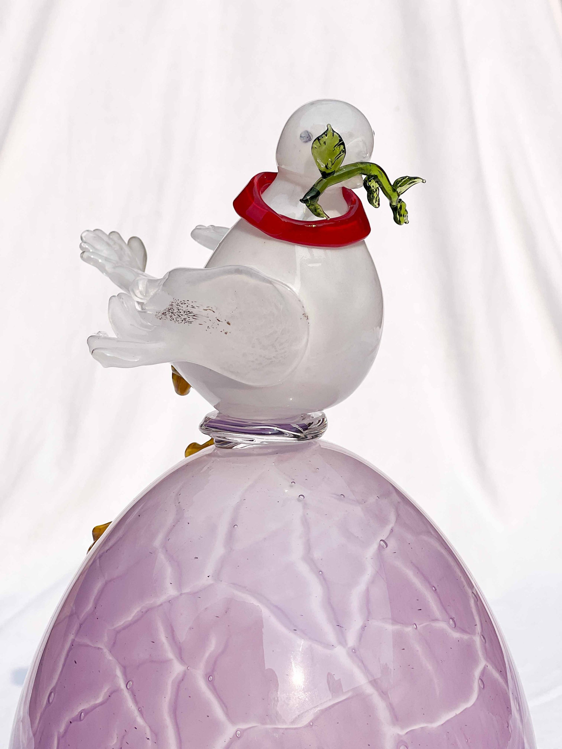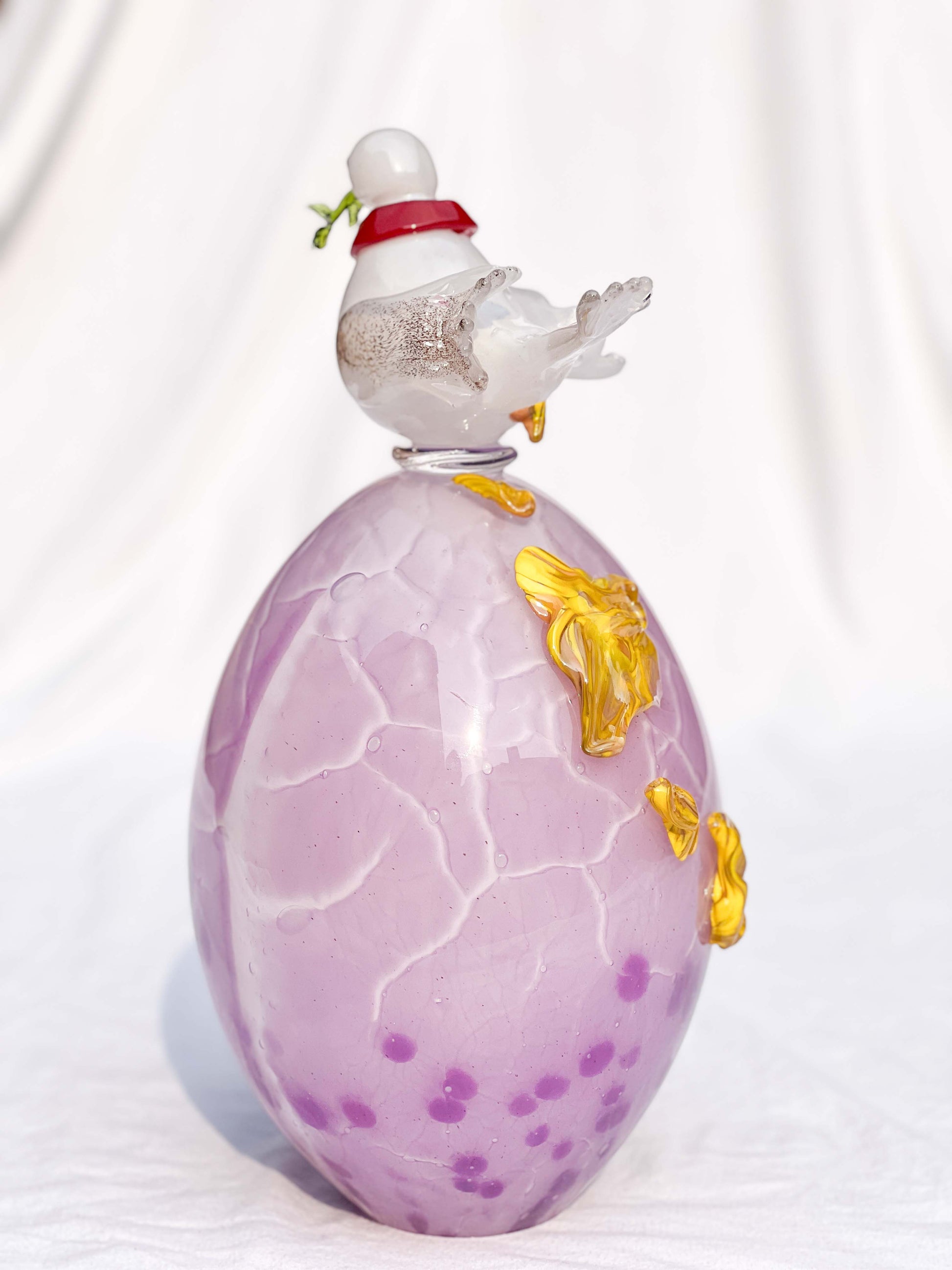 A glass sculpture in the series of 'Eggstentialism', created in collaboration with Czech artist and master glassblower Emil Kováč. The sculpture is a montage of three different glass pieces that is glued together. The glass egg is mouth blown as well as the bird, that is mouth blown and sculpted. The branch in the birds beak is made of flameworked up-cycled glass.
