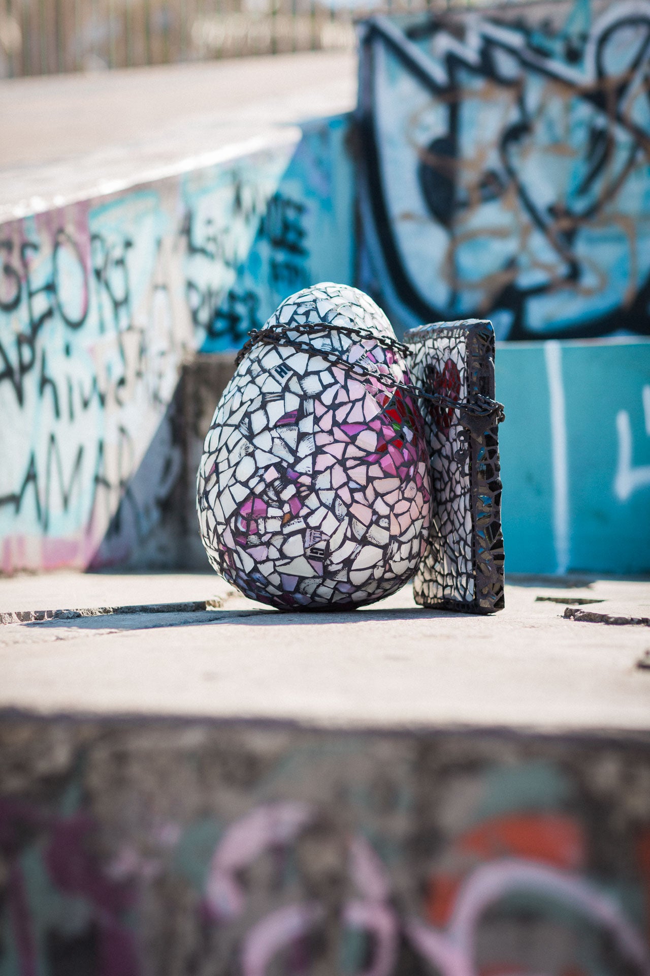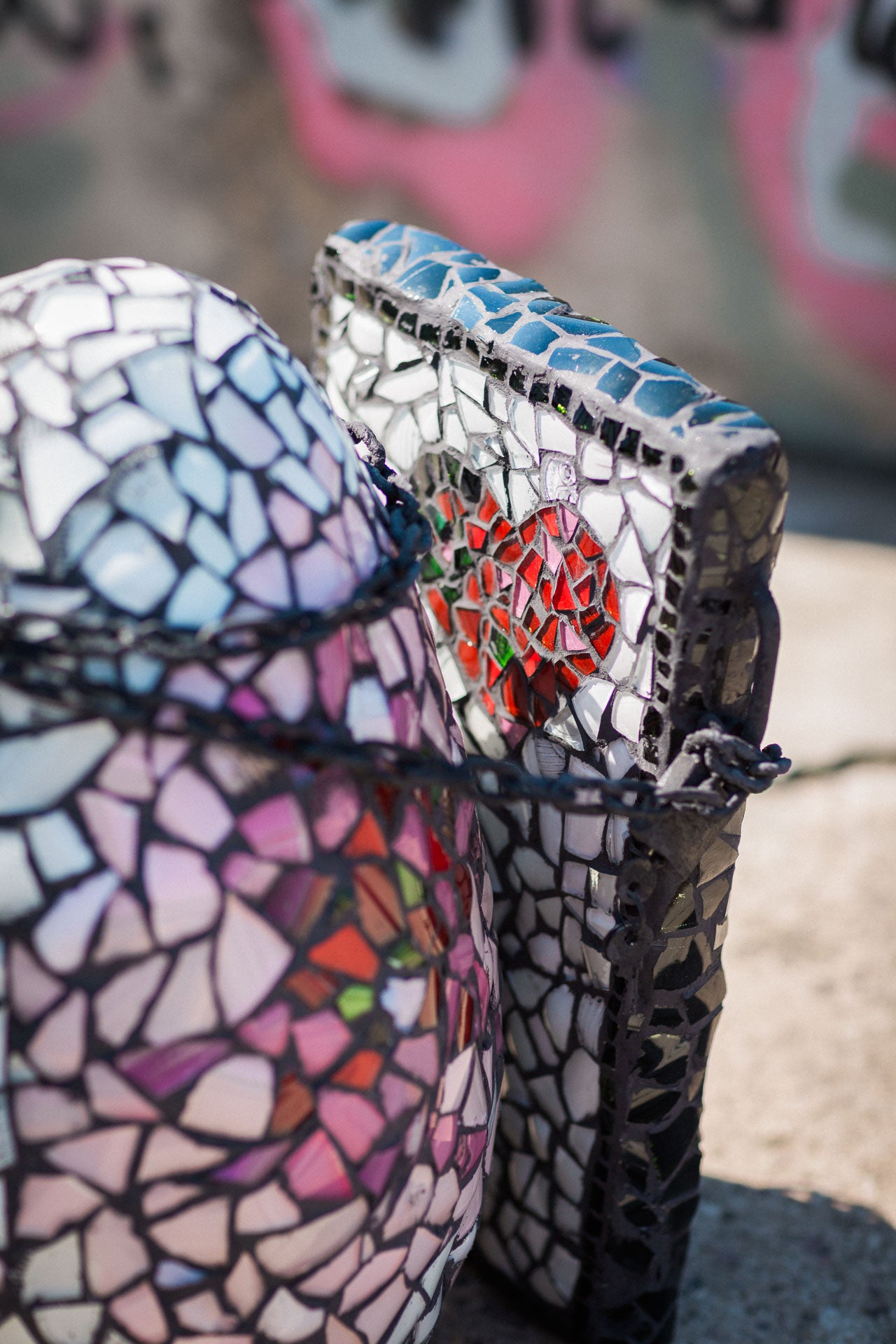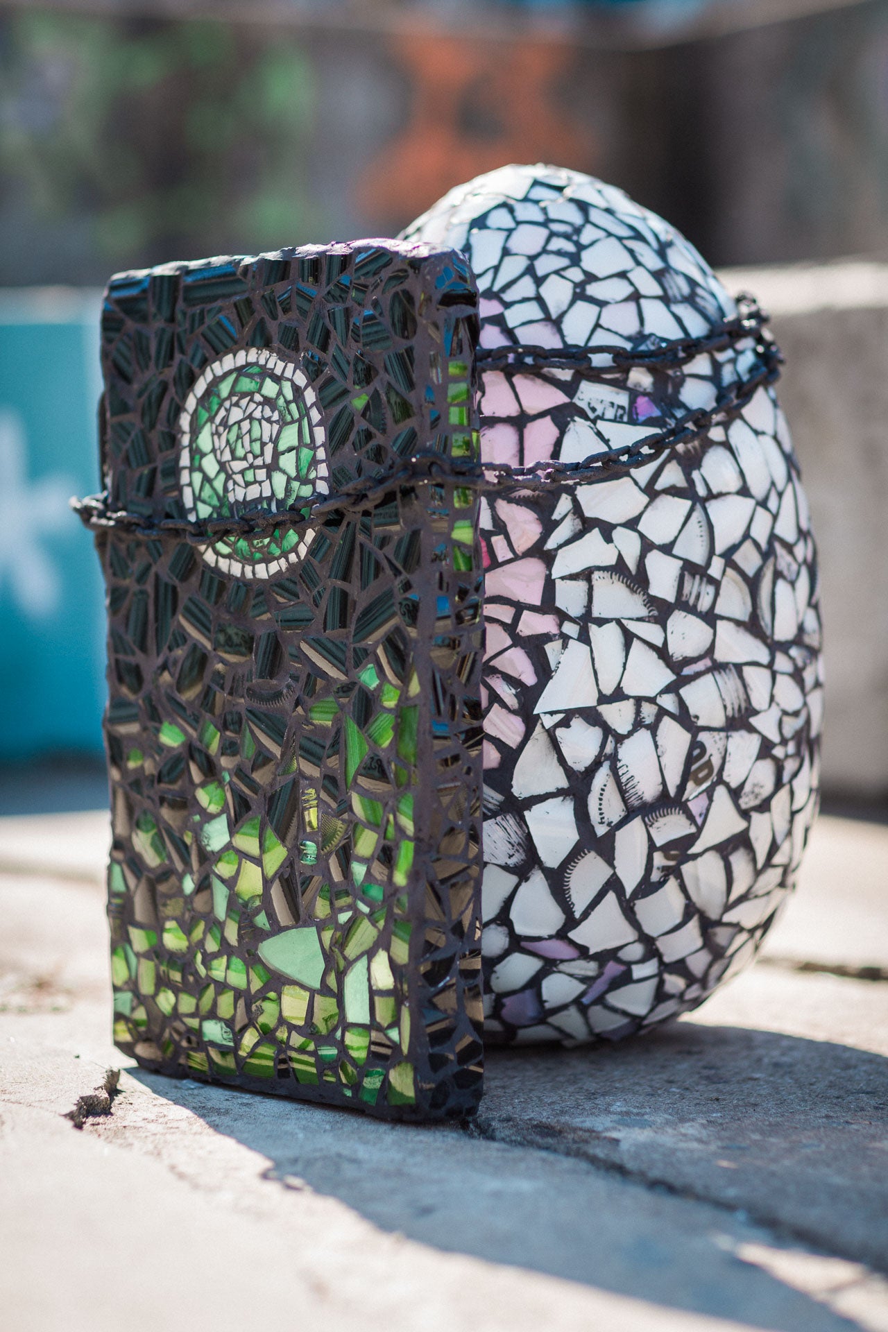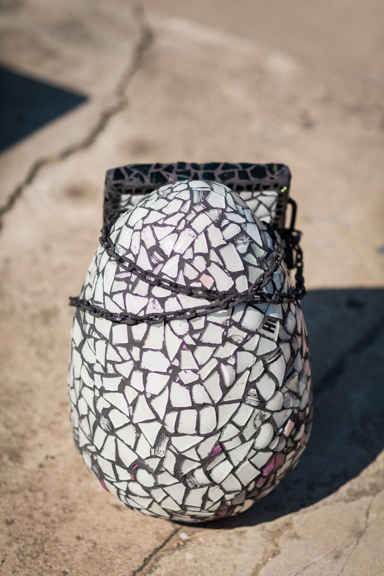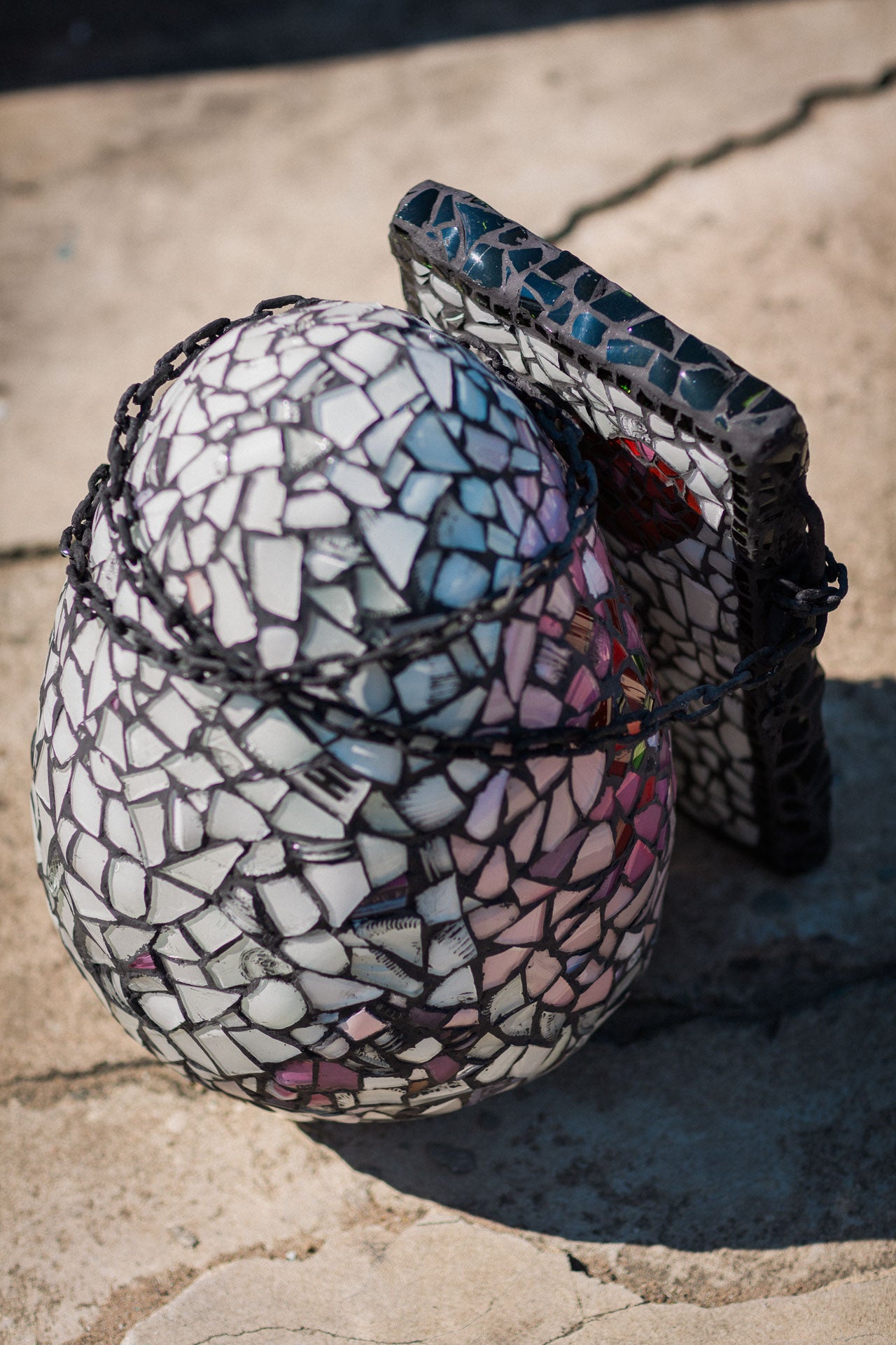 In the series of 'Eggstentialism' this sculptural installation is made up of an egg and a simplified 'cell phone'. The structures of the sculptures are made of netting wire, thinset mortar, tile grout and up-cycled glass mosaics. The two pieces are connected with a textured chain. It's a highly symbolic and expressionistic piece expressing emotions in connections with everyday objects that affects or life and our emotions.
