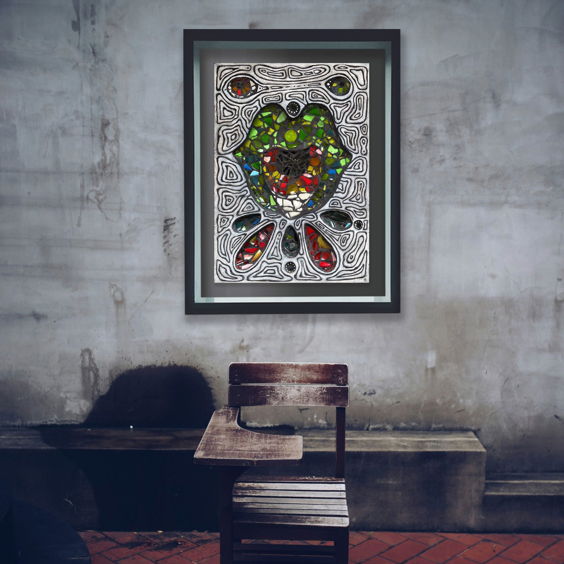The unique mixed media artwork in the series 'Return to Earthiness' is made of up-cycled glass mosaic and painted woodcut. The board the artwork is made of and the mosaics are mounted on, is plywood. This is an experimental artwork and unique in it's kind.