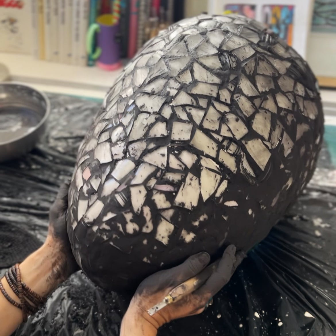 Elin express complex emotions through simplicity, and through various mediums, included, upcycled glass and woodcut. Telling stories using raw lines, patterns and